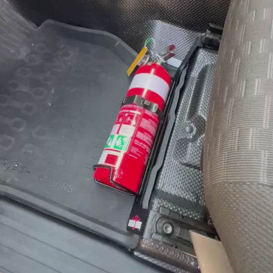Securely mount a 1kg fire extinguisher on the passenger seat rails, without drilling any new holes!
